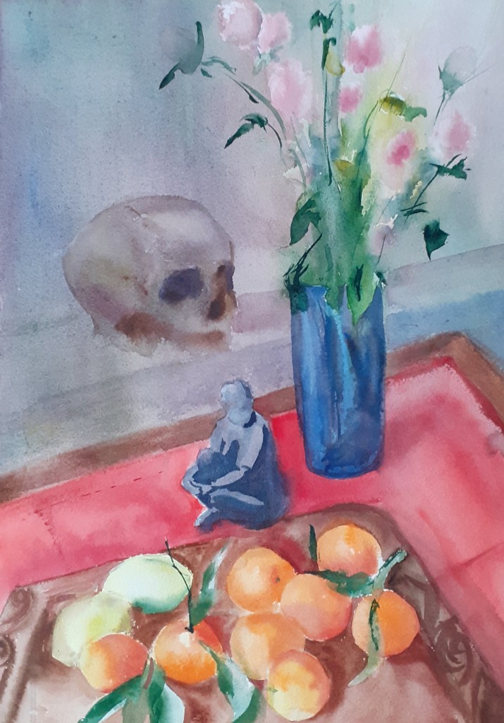 Nature-morte avec des citrons et clémentines (bio), une petite Ève sculptée par Bernadette Wiener, un bouquet de trèfles roses et une apparition inexplicable du crâne de Descartes sur le rebord de ma cuisine